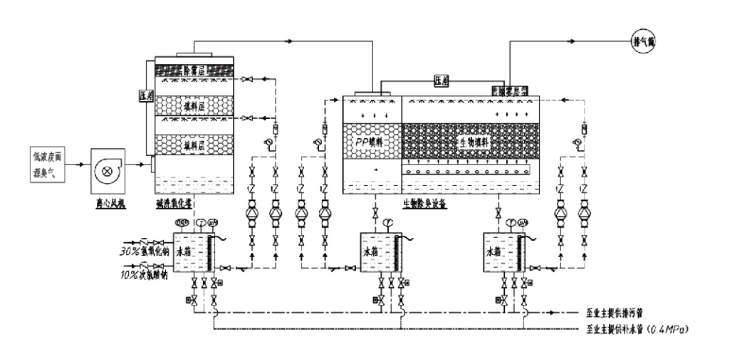 تدمج وحدة الغسل البيولوجي وإزالة الروائح الكريهة بالترشيح ثلاث تقنيات بيولوجية: الغسل البيولوجي، والترشيح البيولوجي المتدفق، والترشيح البيولوجي. تم تطوير جهاز إزالة الروائح البيولوجية المركب الجديد هذا من خلال تجميع مزايا هذه التقنيات البيولوجية الثلاث. تدخل الغازات ذات الرائحة إلى منطقة الغسل عبر المدخل، حيث تخضع للمعالجة الأولية بالماء أو محاليل الغسل الكيميائية المركزة. تكمل منطقة الغسل هذه امتصاص المواد الكيميائية القابلة للذوبان في الماء، وإزالة الغبار، وترطيب الغازات ذات الرائحة. تنتقل الغازات ذات الرائحة الكريهة غير المزالة بعد ذلك إلى منطقة ترشيح طبقة المرشح الحيوي متعددة المراحل. أثناء مرورها عبر طبقة الفلتر، تنتقل الملوثات من الطور الغازي إلى سطح الغشاء الحيوي: