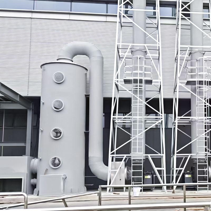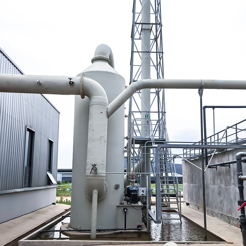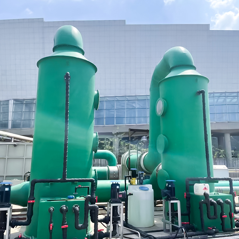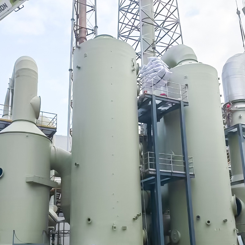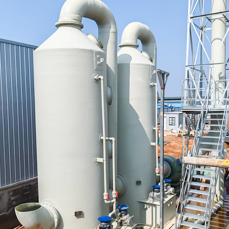 - برج امتصاص الماء (معالجة كلوريد الهيدروجين): حمض الهيدروكلوريك قابل للذوبان في الماء بسهولة ويمكن إزالته مباشرة من خلال امتصاص رذاذ الماء. وهذا مناسب لغاز نفايات حمض الهيدروكلوريك عالي التركيز (على سبيل المثال، التخليق الكيميائي، وتخليل المعادن). بعد الامتصاص، يمكن إعادة تدوير حمض الهيدروكلوريك المخفف الناتج.